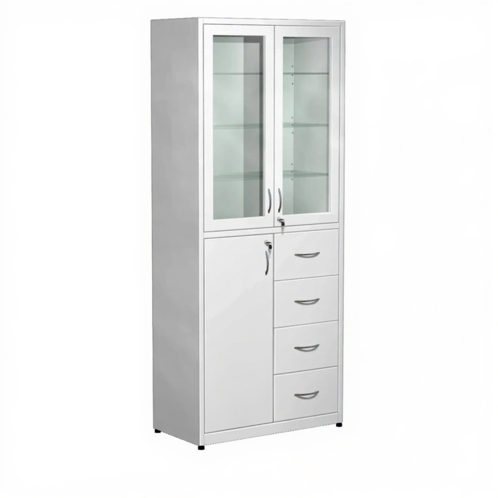 Шкаф для медикаментов стекло в металлической рамке, с ящиками ШМ-4.1 (белый) активно используются в больницах, лабораториях, аптеках, где необходимо хранение медикаментов, медицинского инвентаря, одежды работников, приборов, больничной документации.
