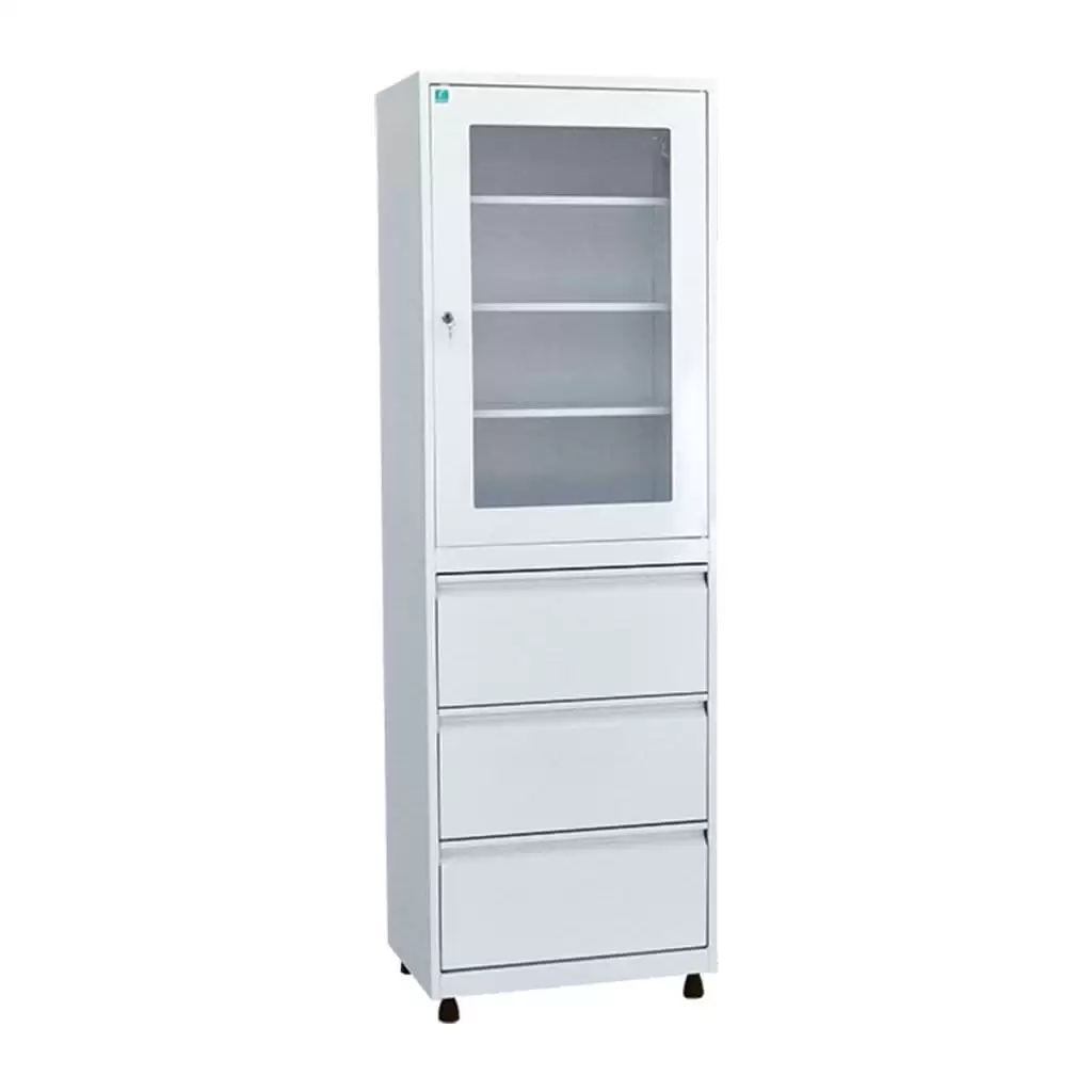 - в верхней части шкафа находится стеклянная дверь в металлической окантовке, за дверью находятся 3 металлические полки;