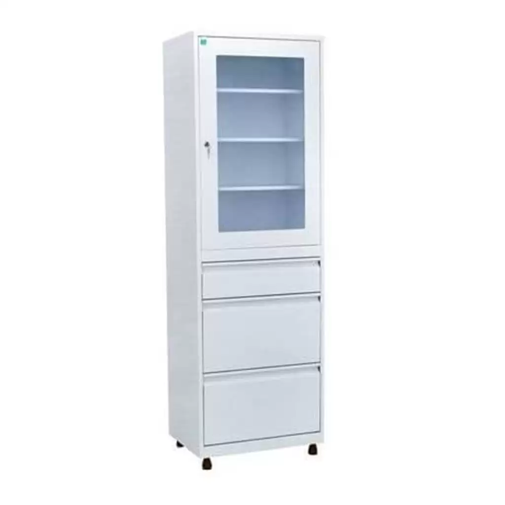 - в верхней части шкафа находится стеклянная дверь в металлической окантовке, за дверью находятся 3 металлические полки;