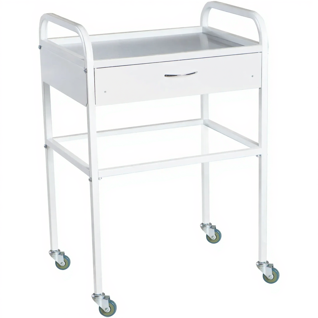 Столик медицинский инструментальный СМИ-02-01 (полки металл + стекло, колёса серая резина) — это компактный мобильный столик, предназначенный для размещения инструмента, лекарственных препаратов и приборов в медицинских учреждениях и лабораториях. Модель имеет каркас из профильной стальной трубы, один выдвижной ящик и комбинированные полки (металл и стекло).