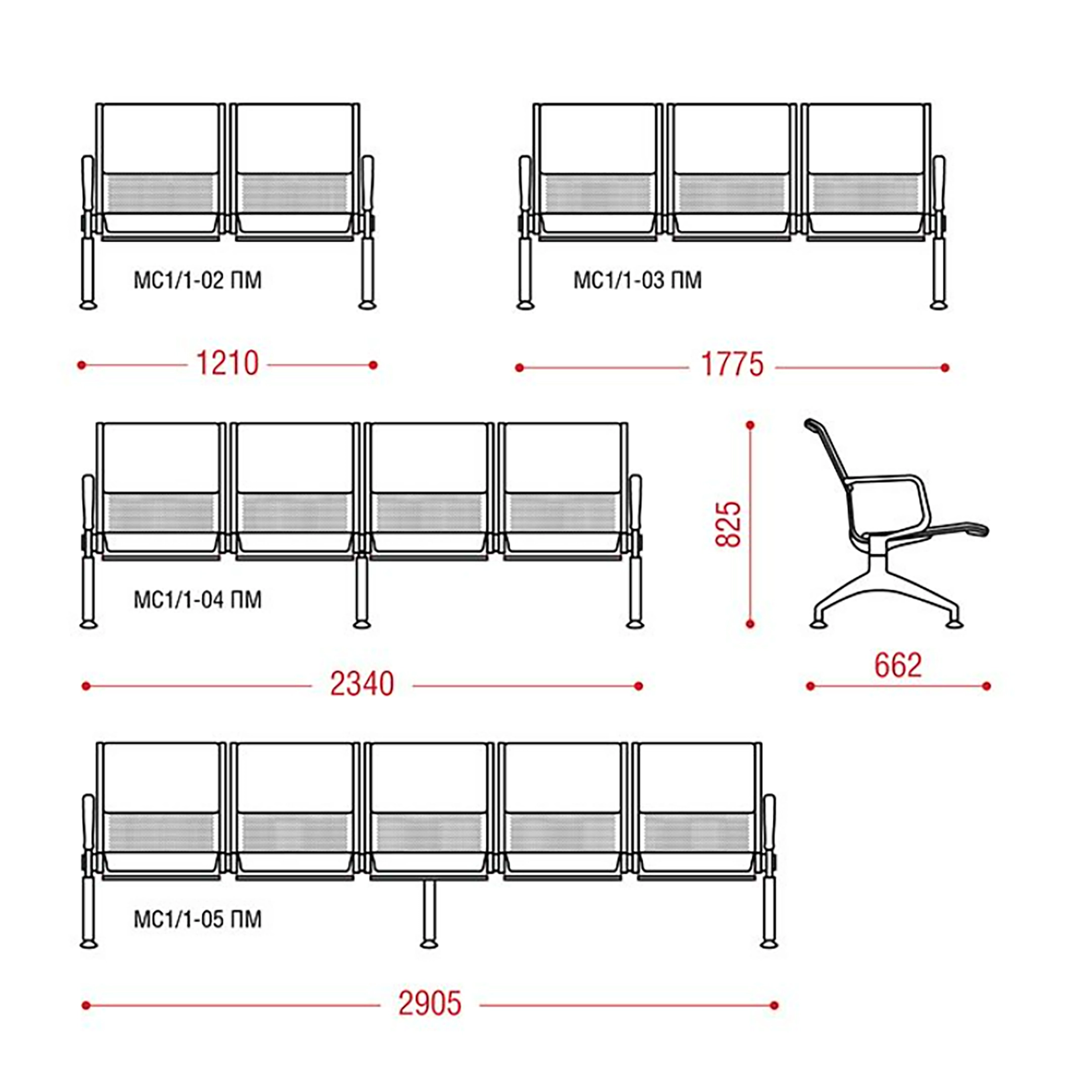 Стоимость указана за модель в искусственной коже 2 категории; покрытие металлокаркаса: балка - RAL 9005 "черный муар", перфорация - RAL 7001 "серый" и с хромированными элементами (подлокотники, опоры и окантовка сидений). Все варианты материалов и цветов обивки, варианты окрашивания металлических каркасов на последних фото.
