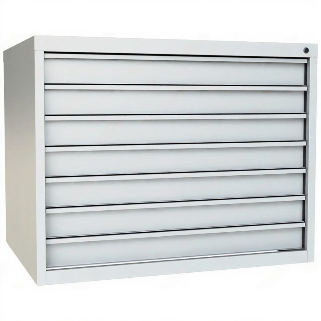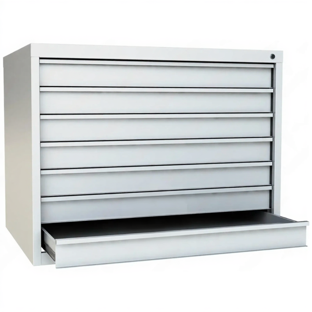 - Специализированное хранение чертежей А1 — шкаф точно рассчитан на горизонтальное хранение листов формата А1 (594x841 мм). Семь металлических планшетов (лотков) с высокими бортиками надежно защищают ценные оригиналы чертежей, схем и плакатов от сминания, загибов и повреждений.