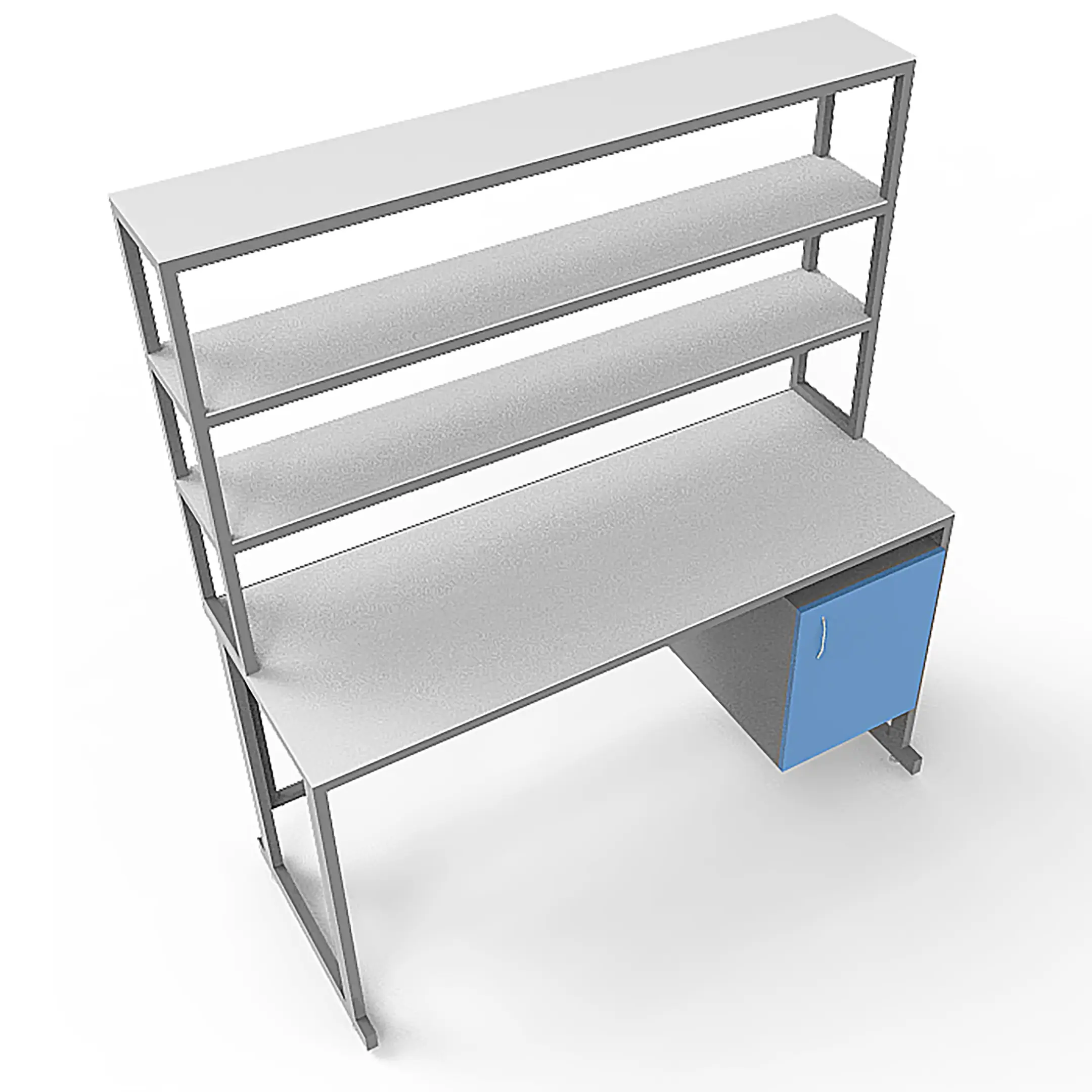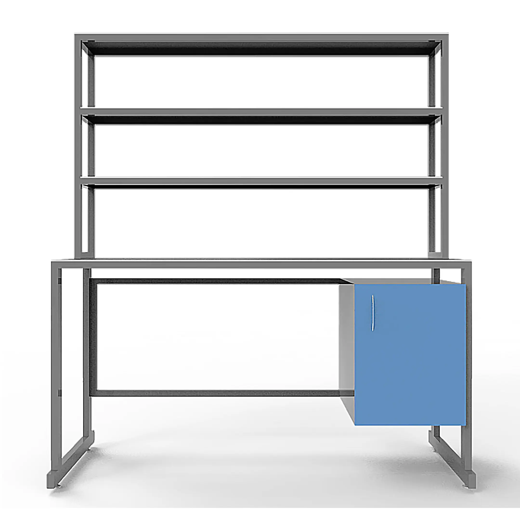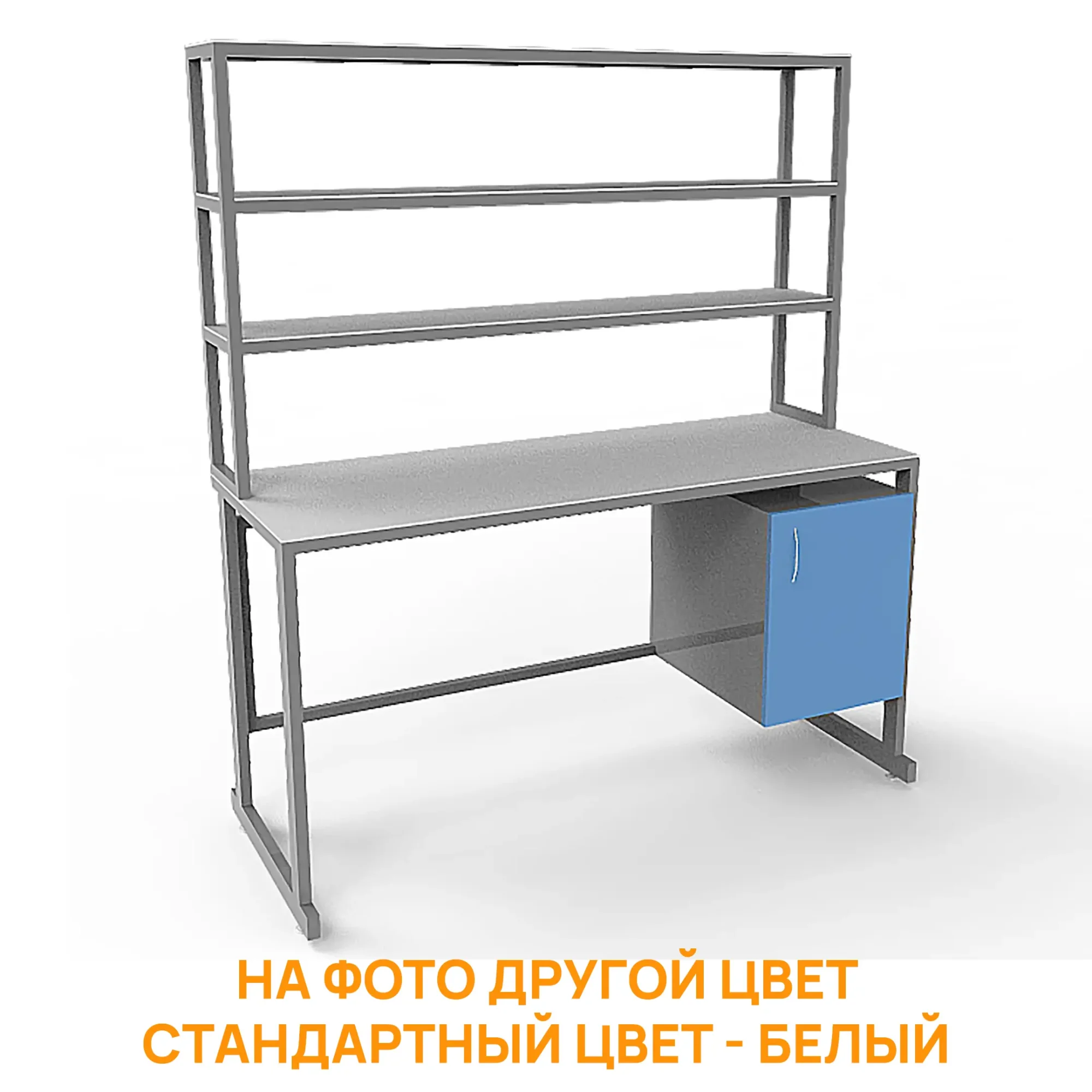 - Удобная система хранения — тумба под столешницей с распашной дверцей и надстройка с тремя полками для хранения материалов и оборудования.