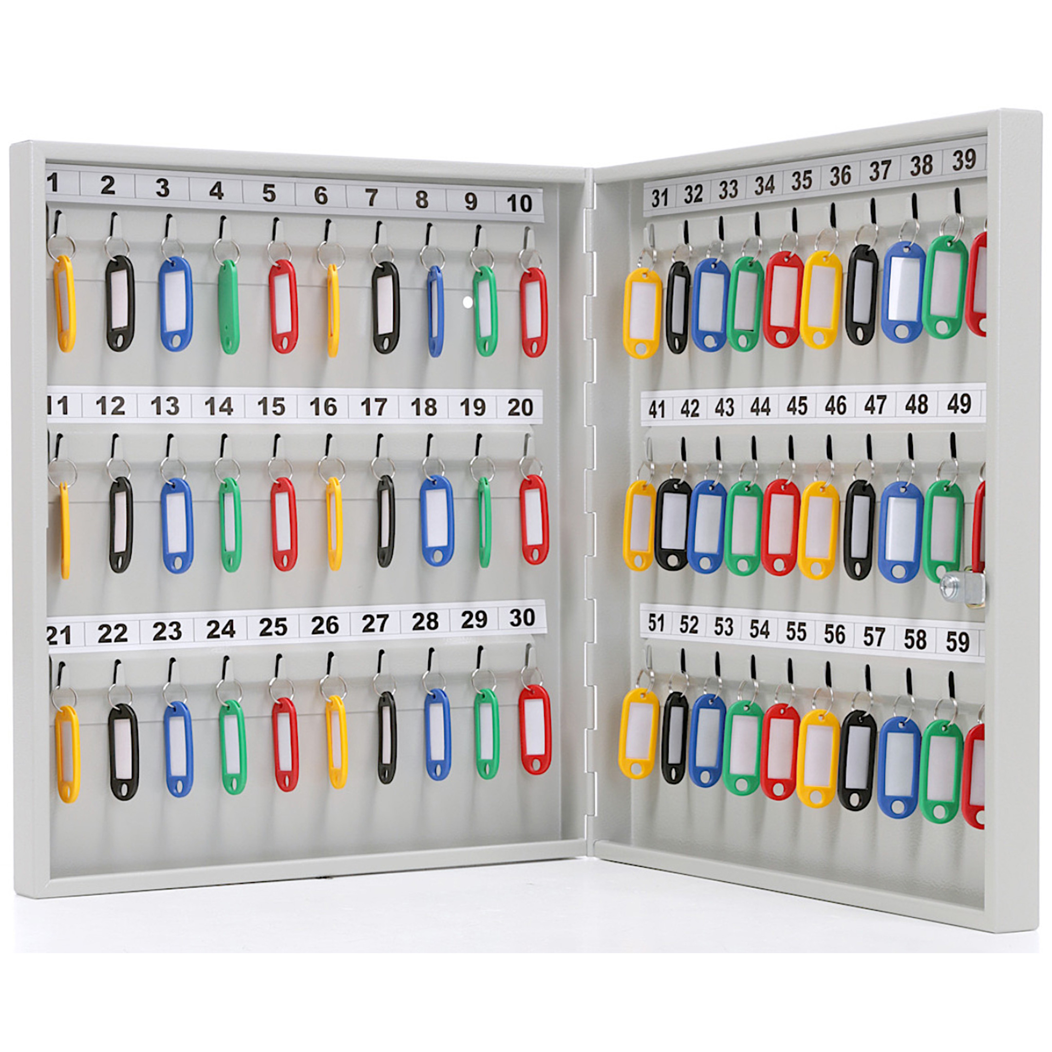 - Эффективная организация и быстрый поиск — шестьдесят пронумерованных ячеек и комплект брелков создают четкую и прозрачную систему. Это позволяет мгновенно находить нужный ключ, вести точный журнал учета и легко контролировать их выдачу и возврат ответственными лицами, повышая операционную эффективность.