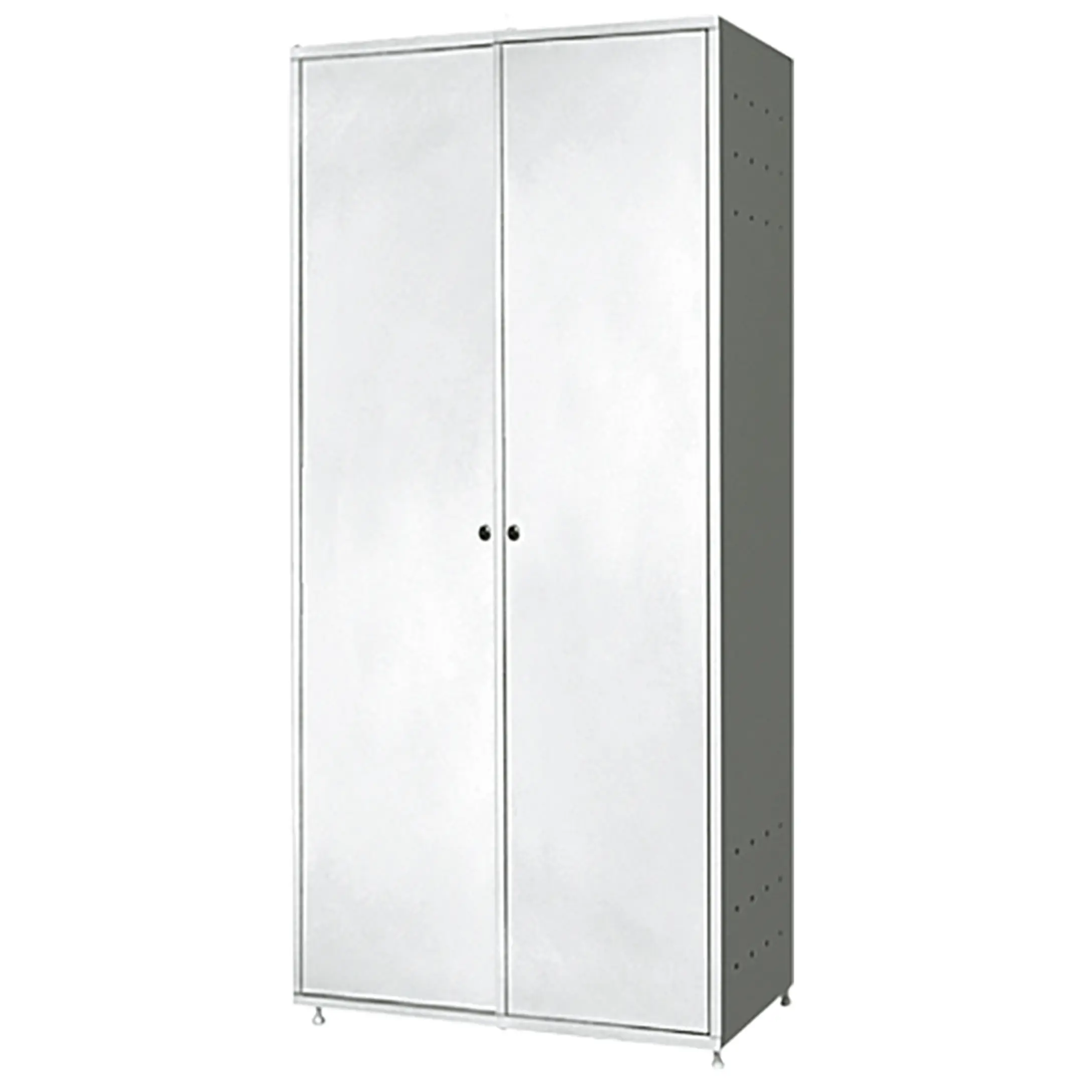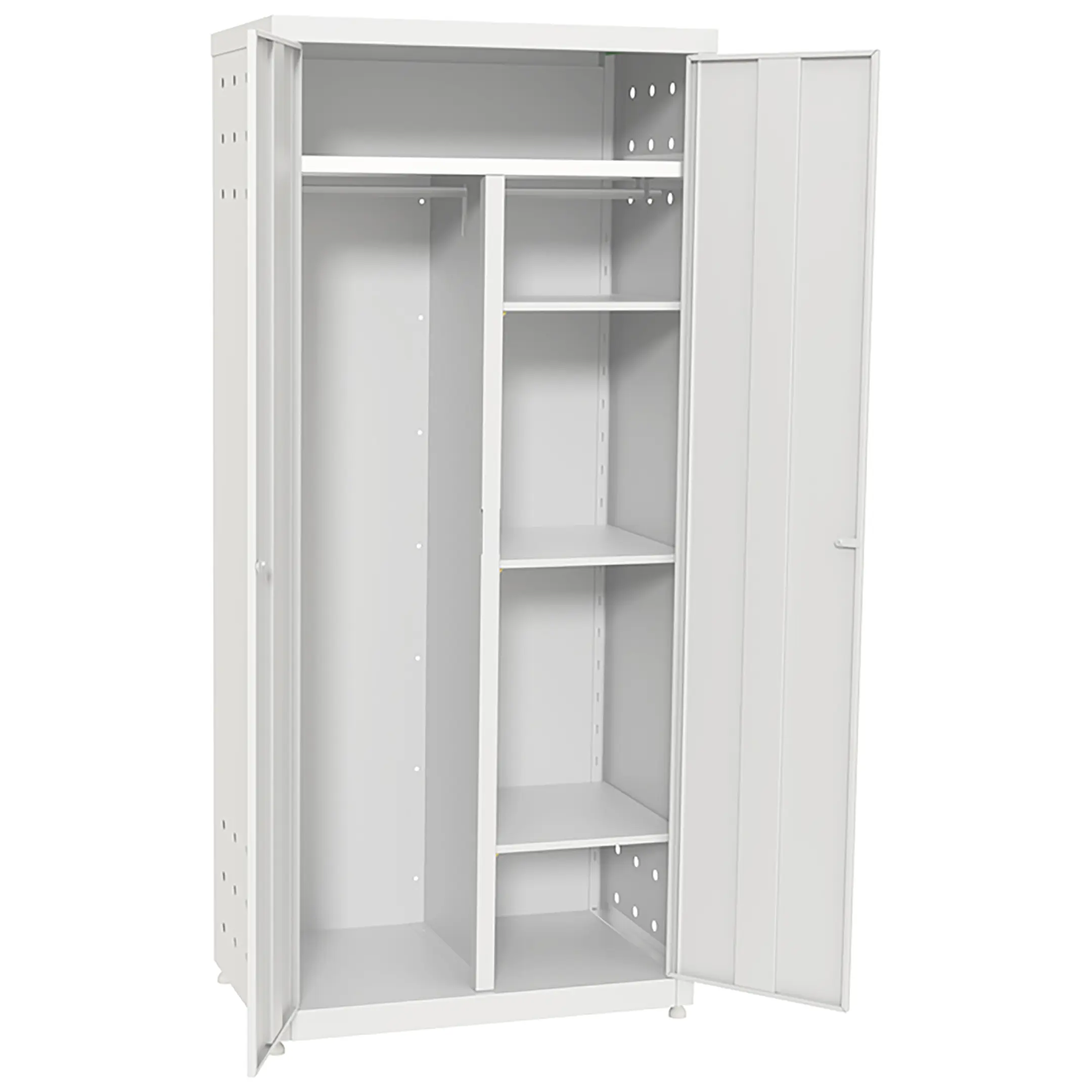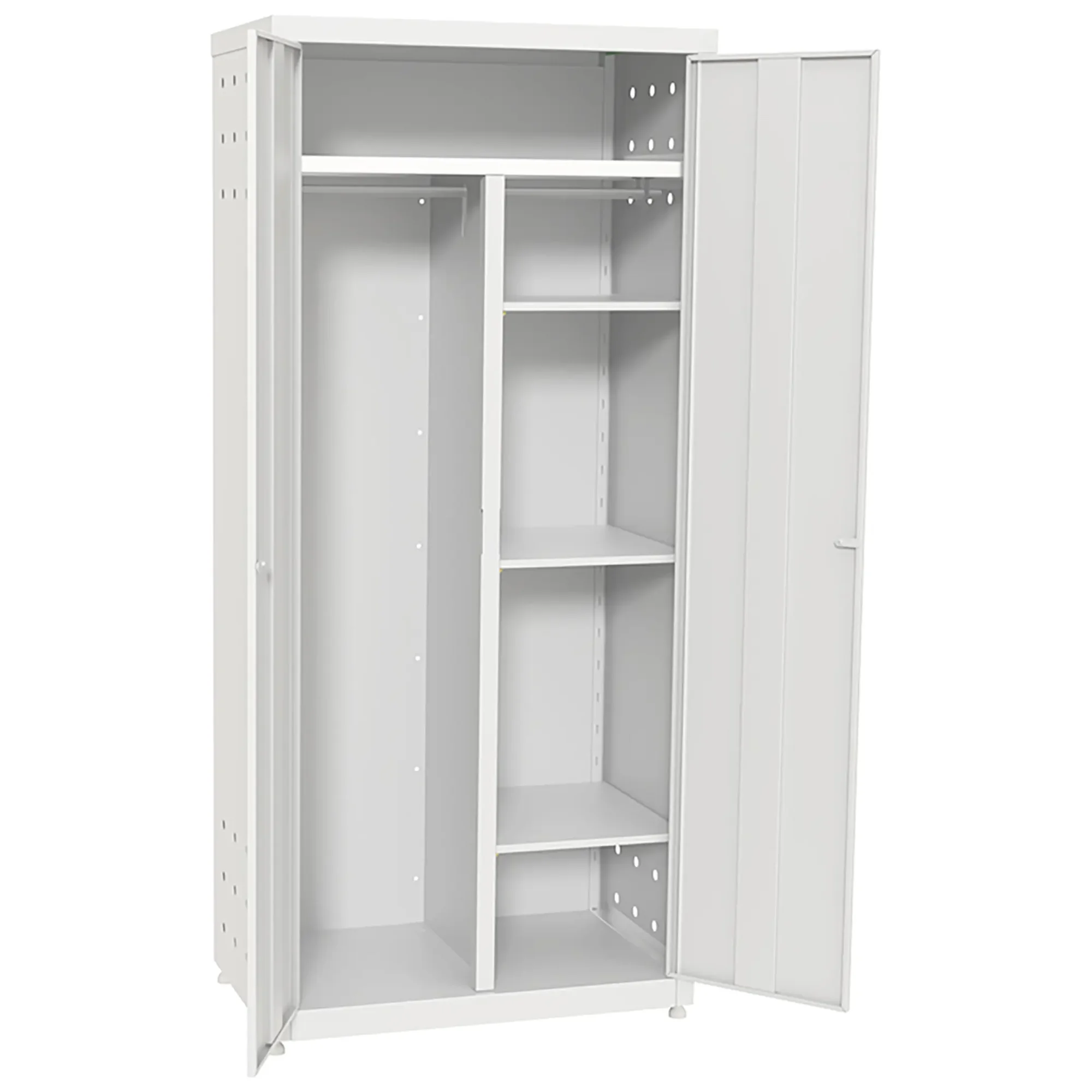 - Поддержание чистоты и гигиены — конструкция способствует проветриванию и просушке влажного инвентаря (швабр, тряпок), предотвращая развитие плесени и неприятных запахов. Закрывающиеся дверцы защищают содержимое от пыли и посторонних загрязнений, поддерживая санитарные нормы в помещении.