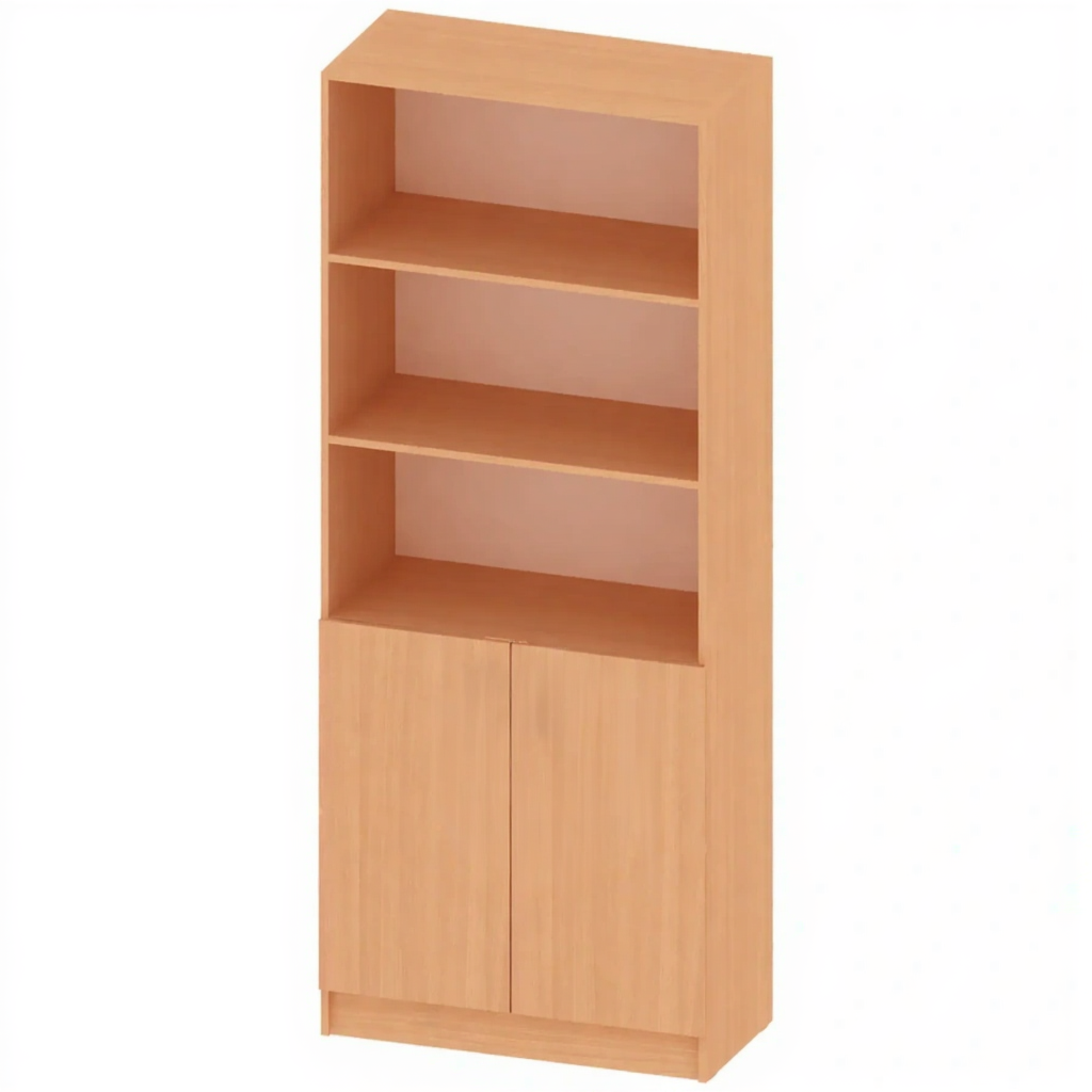 - Комбинированная конструкция — открытые полки для быстрого доступа к часто используемым пособиям и нижнее закрытое отделение с двумя дверцами для хранения материалов, требующих защиты.