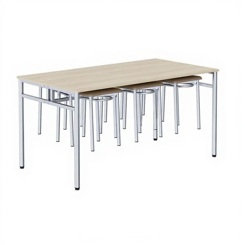Стол имеет встроенные металлические подвесы, на которые можно закрепить табуреты, и без помех убрать помещение. Также это подстолье решает проблему быстрого переноса столов в другое место сразу с комплектом стульев, что может быть весьма удобно в случае расстановки столов для какого-либо события, например, банкета или свадьбы.