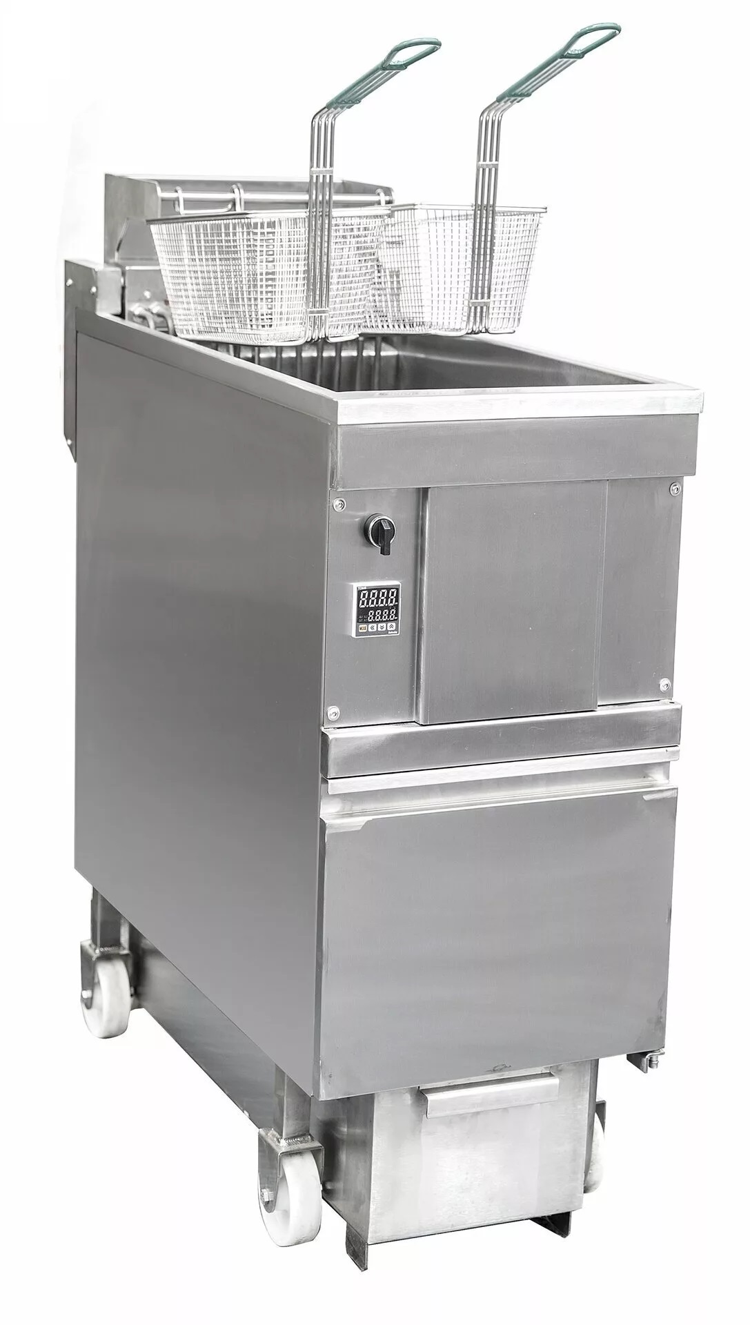 Фритюрница электрическая с системой фильтрации масла на закрытом стенде с одной ванной объёмом 25л. Блок управления температурой расположен на фронтальной части фритюрницы.