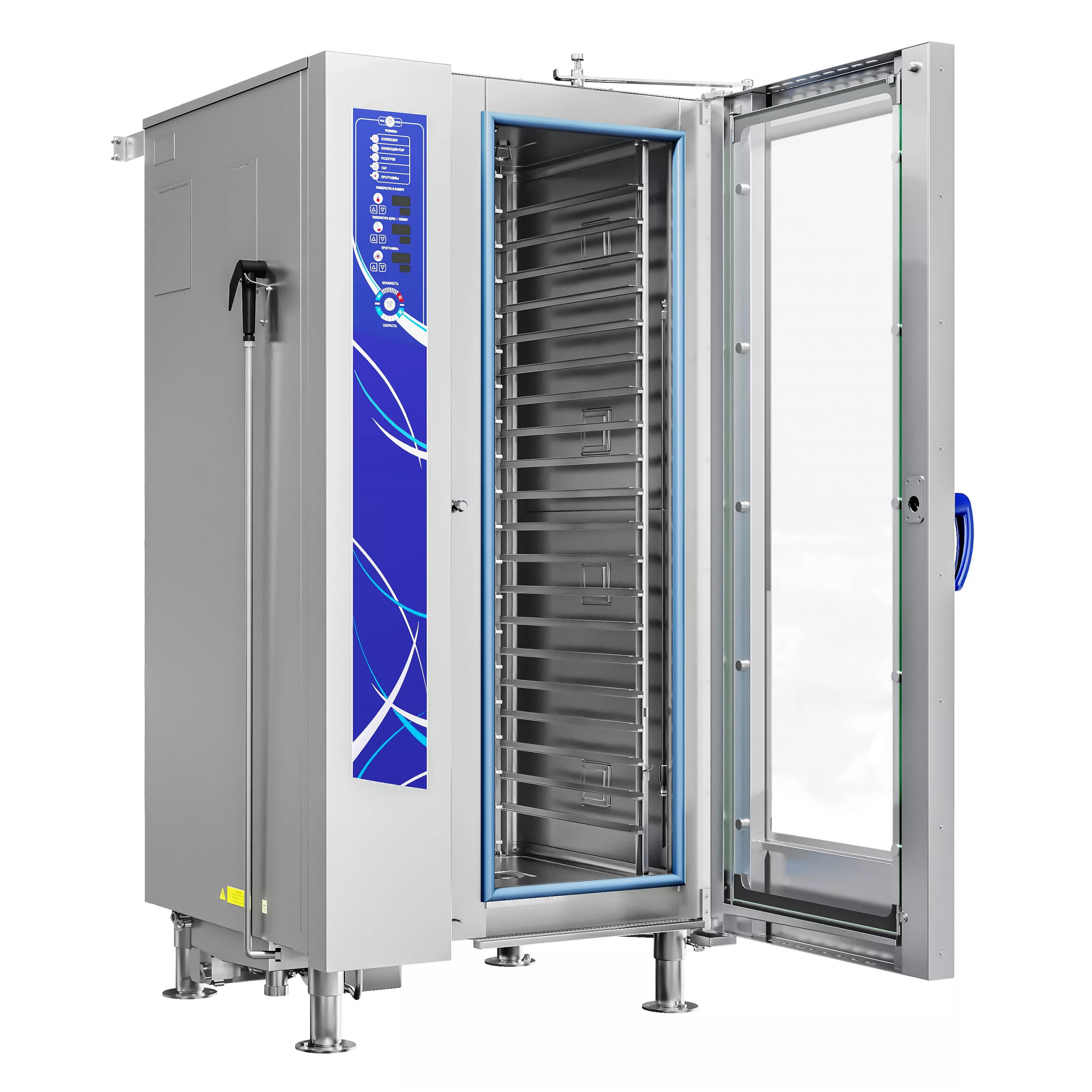 5 скоростей вентилятора, реверс. Режимы приготовления: конвекция (до 270°С), конвекция+пар (до 250°С), разогрев с паром (до 160°С), низкотемпературный пар (до 98°С), пар (100°С). Степень защиты камеры IPX5. Двойное остекление дверцы, скругленные углы камеры и открывающееся внутреннее стекло для удобства очистки. Двухходовой механизм открывания дверцы для защиты от пара, система закрытия дверцы «свободные руки». Лоток для сбора конденсата, система охлаждения слива, низкий уровень шума.