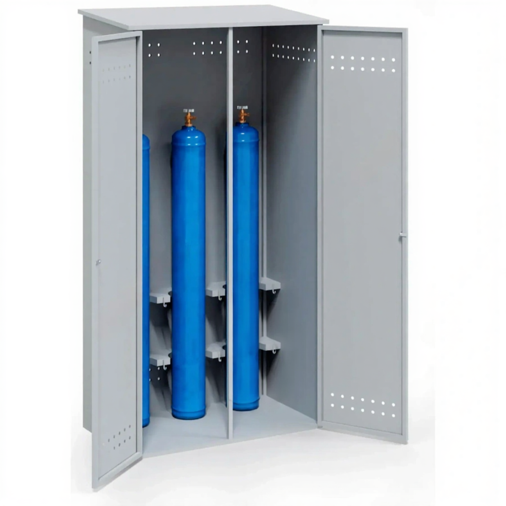 - Классическая и проверенная вместимость — шкаф рассчитан на хранение трех газовых баллонов, что является стандартом для множества операций: сварочный пост (горючий газ + кислород), сервисное обслуживание оборудования, лабораторные работы. Эта модель закрывает базовую потребность в безопасном хранении, оставаясь при этом компактной и не занимающей лишнего пространства.