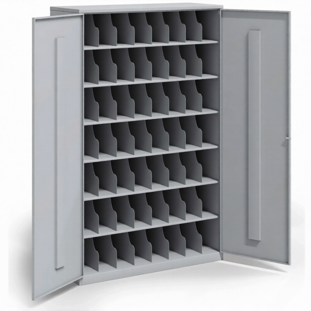 • 56 ячеек, две дверцы, скошенные полки для удобства хранения СИЗ.