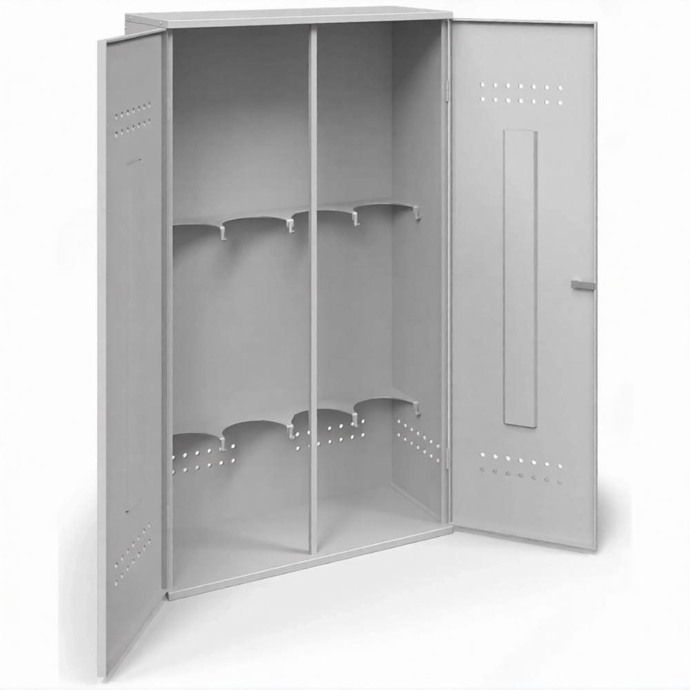 - Обеспечение базового уровня пожарной безопасности — металлический корпус, даже толщиной 0,8 мм, создает физический барьер между баллонами и возможными источниками огня или искр (например, от болгарки). Наличие вентиляционных отверстий обеспечивает необходимый воздухообмен для предотвращения скопления газа, что является главным приоритетом согласно простейшим правилам безопасной эксплуатации.