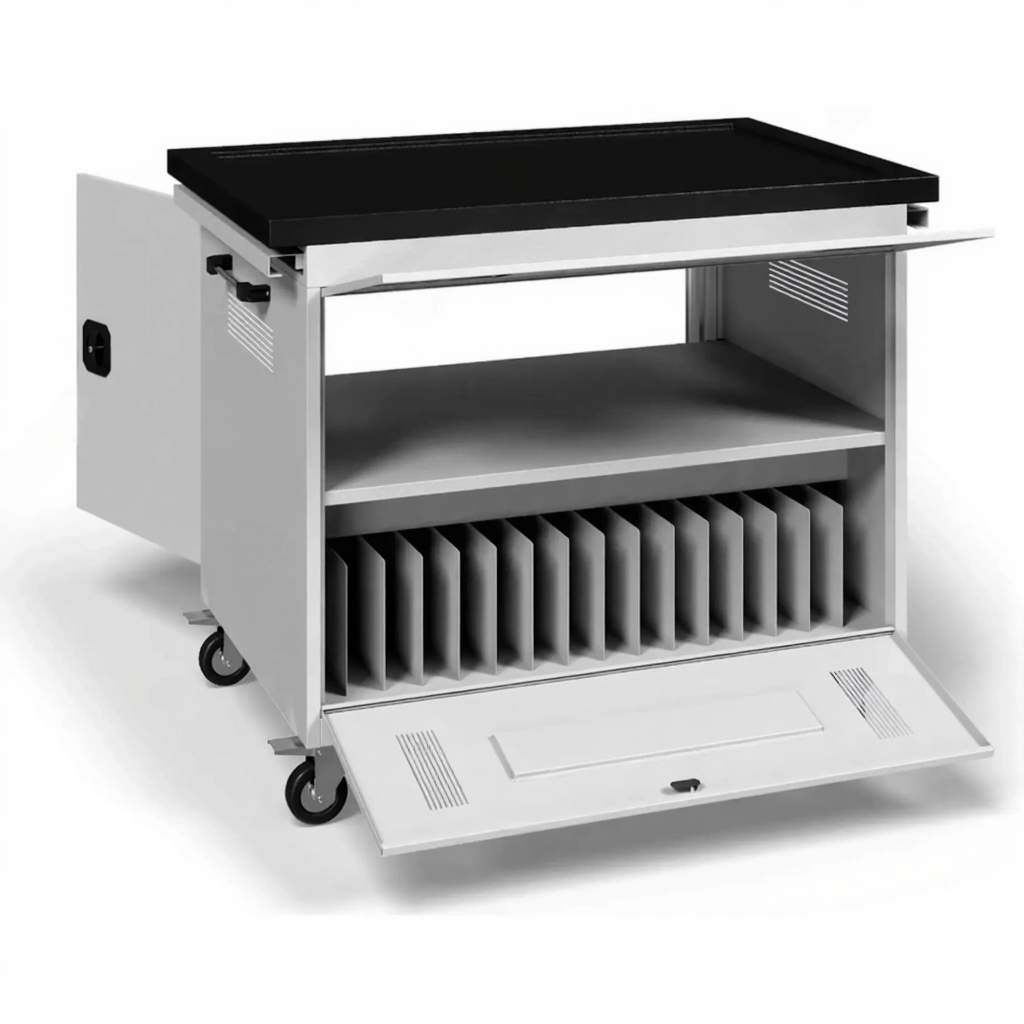 - Универсальность хранения — подходит как для ноутбуков, так и для планшетов популярного формата 15,6 дюйма, что позволяет использовать одну тележку для разного типа устройств в зависимости от потребностей.